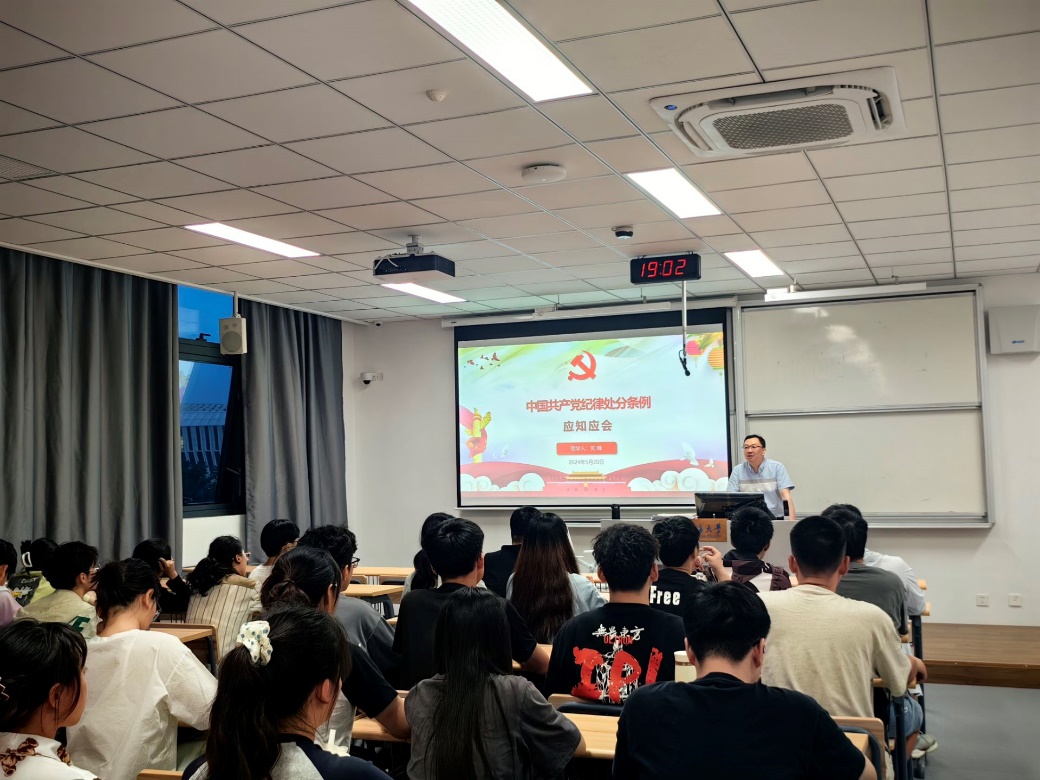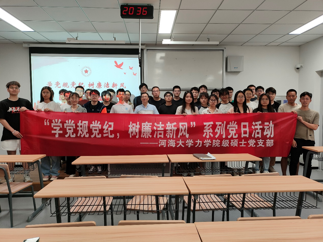 5月20日,力学院2023级硕士党支部在常州校区2号楼A211开展“学党规党纪,树廉洁新风”主题党日活动。学院党委副书记、副院长刘峰讲授党纪学习教育专题党课,常州校区的研究生、本科生60余人参加。