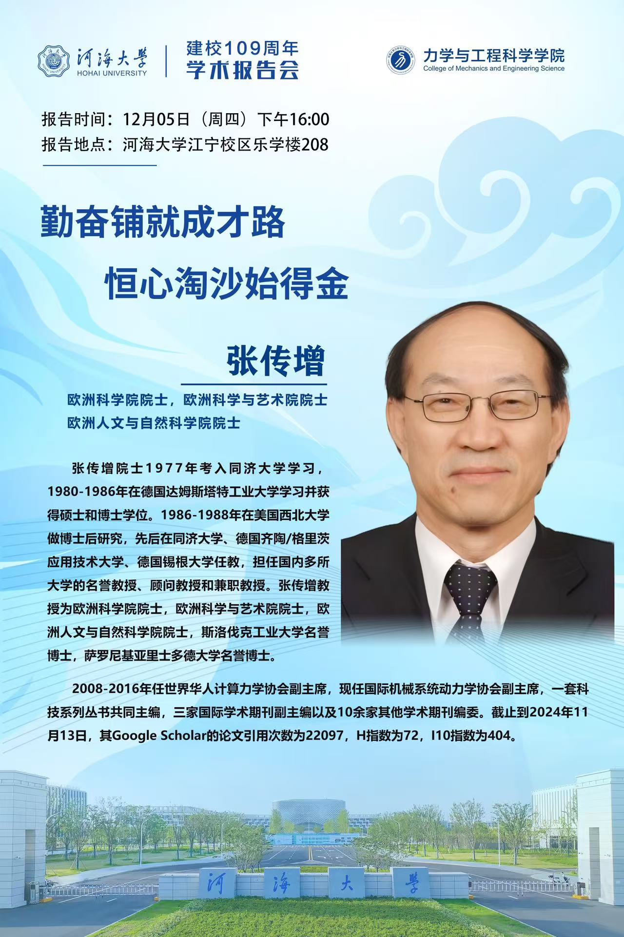 伟德体育院士讲座通知(2024-57):勤奋铺就成才路,恒心淘沙始得金