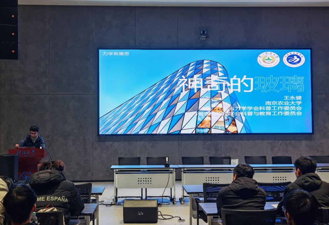 12月6日下午,由河海大学科技处、科协主办,伟德体育承办的科普大讲堂第五讲在常州校区55号楼139会议室举行。本期科普大讲堂的主题为“力学科普——神奇的玻璃及科普创作”,主讲人为南京农业大学工学院机械工程系副主任、副教授王永健,常州校区100余名本科生和研究生同学参加了此次科普活动。