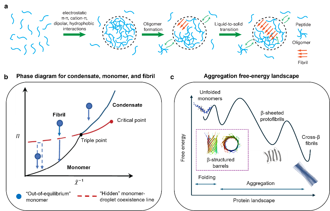 (a)软物质的液液相分离;(b)单体、凝聚物和纤维结构的相图;(c)软物质聚集过程的自由能形貌