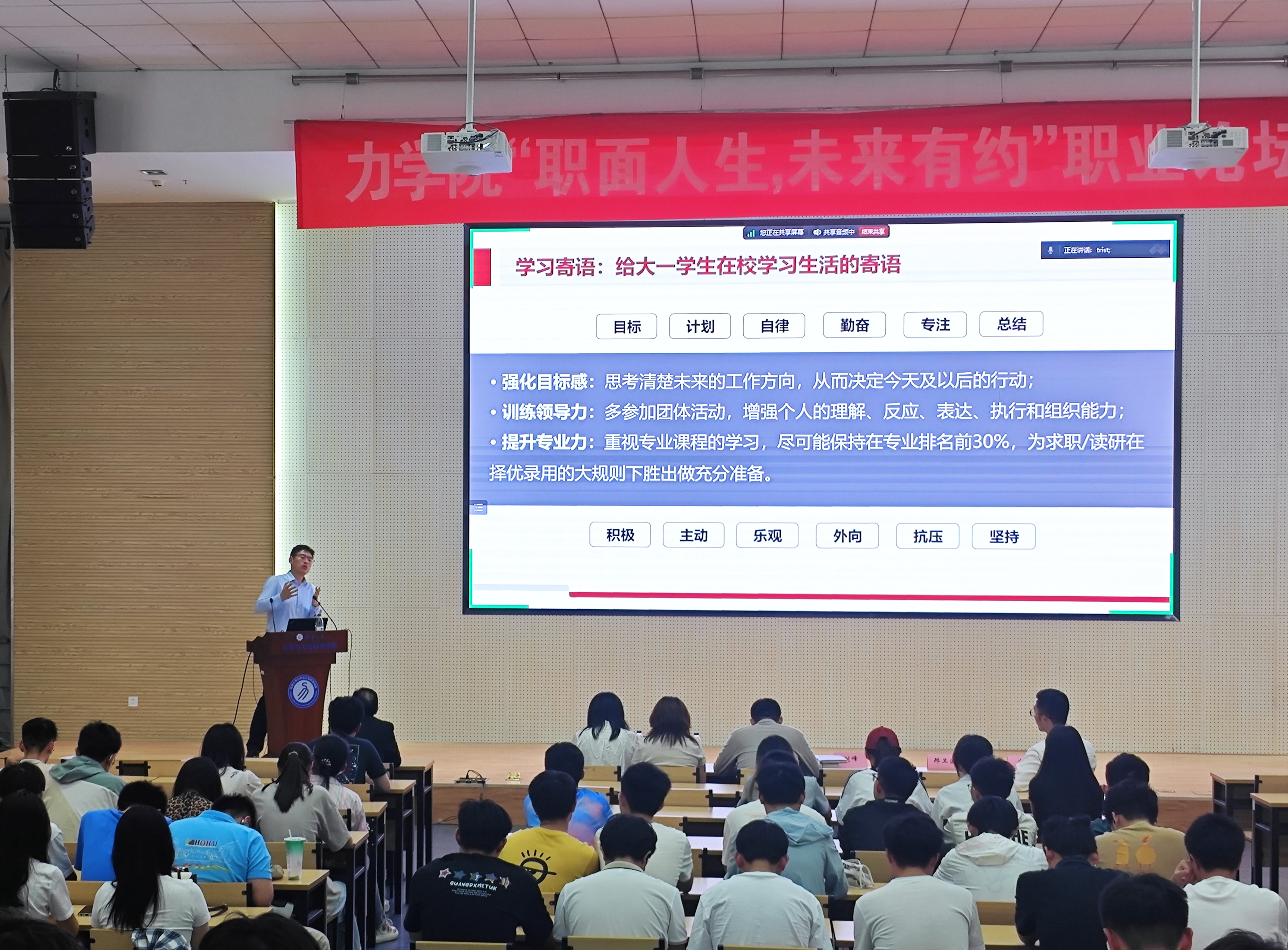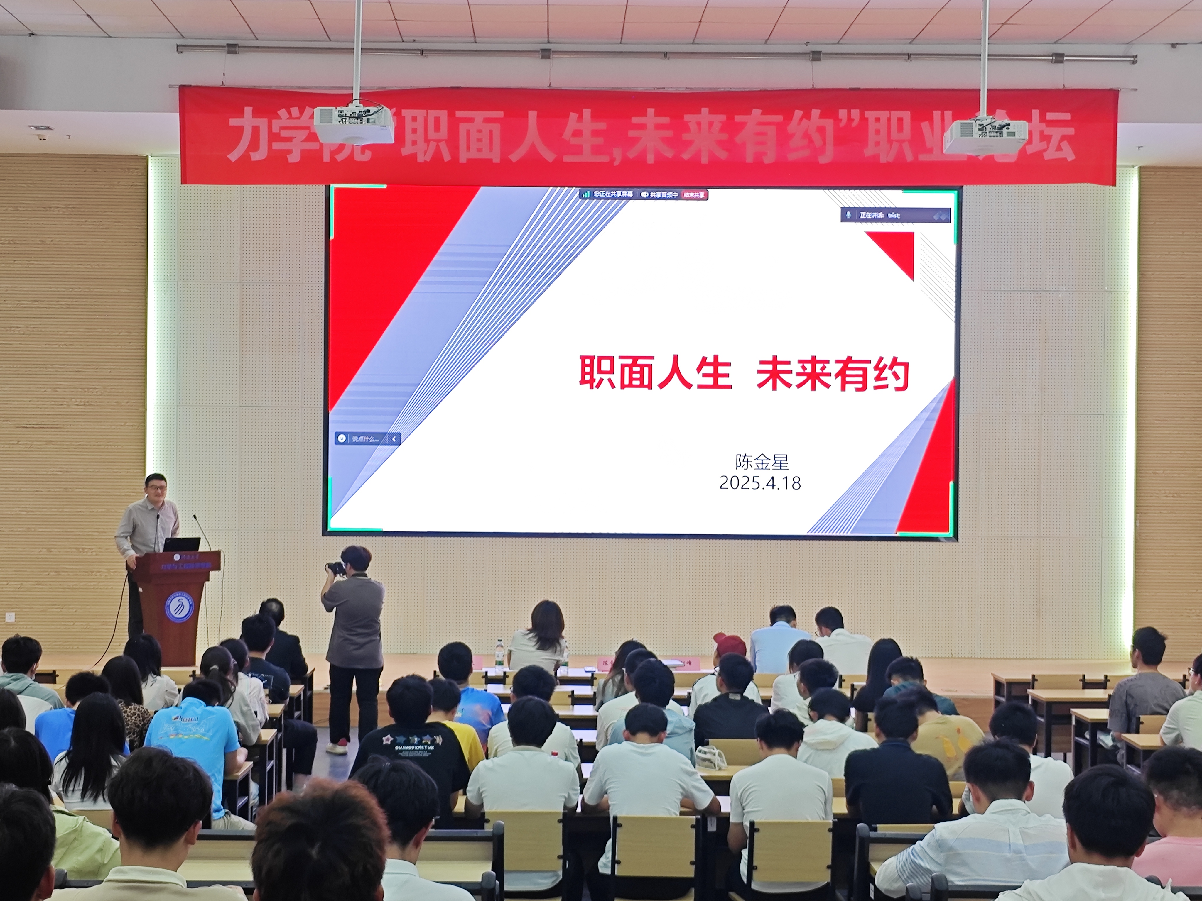 2016届应用物理学校友陈金星回顾了在校学习和步入职场后不断学习成长,增强职业能力的经历,强调了持续学习力和适应变化力在职场中的关键作用。建华控股苏南区域人力资源部刑卫波总经理,剖析当前毕业生就业前景,通过生动案例,希望同学们要提升综合竞争力,为应对未来复杂多变的职场环境做好准备。2022届工程力学校友王泽霖讲述了他在校求学经历以及毕业后的求职过程,鼓励同学们用求真的态度、广阔的胸襟、踏实的作风去应对随时可能出现的变化。