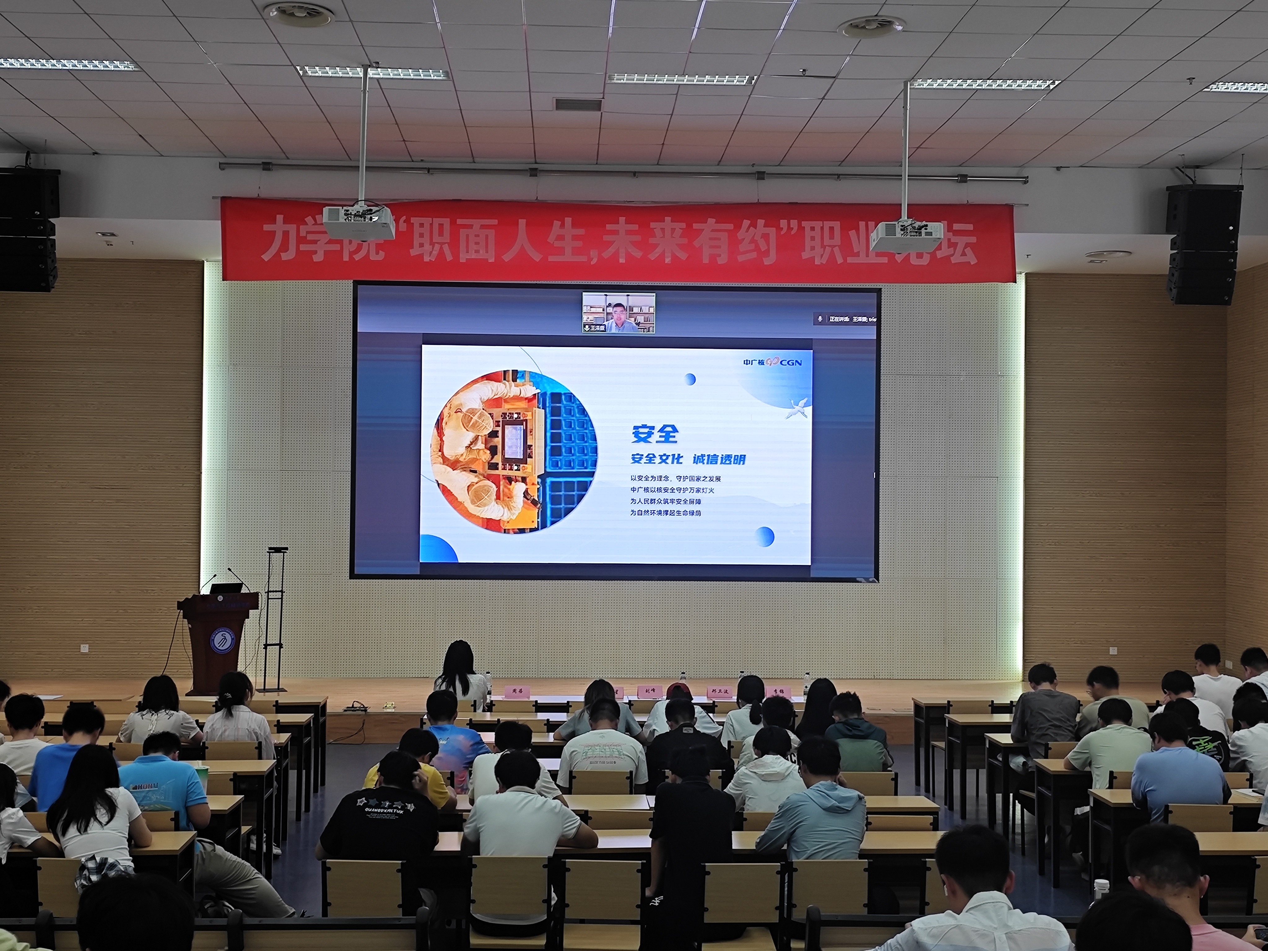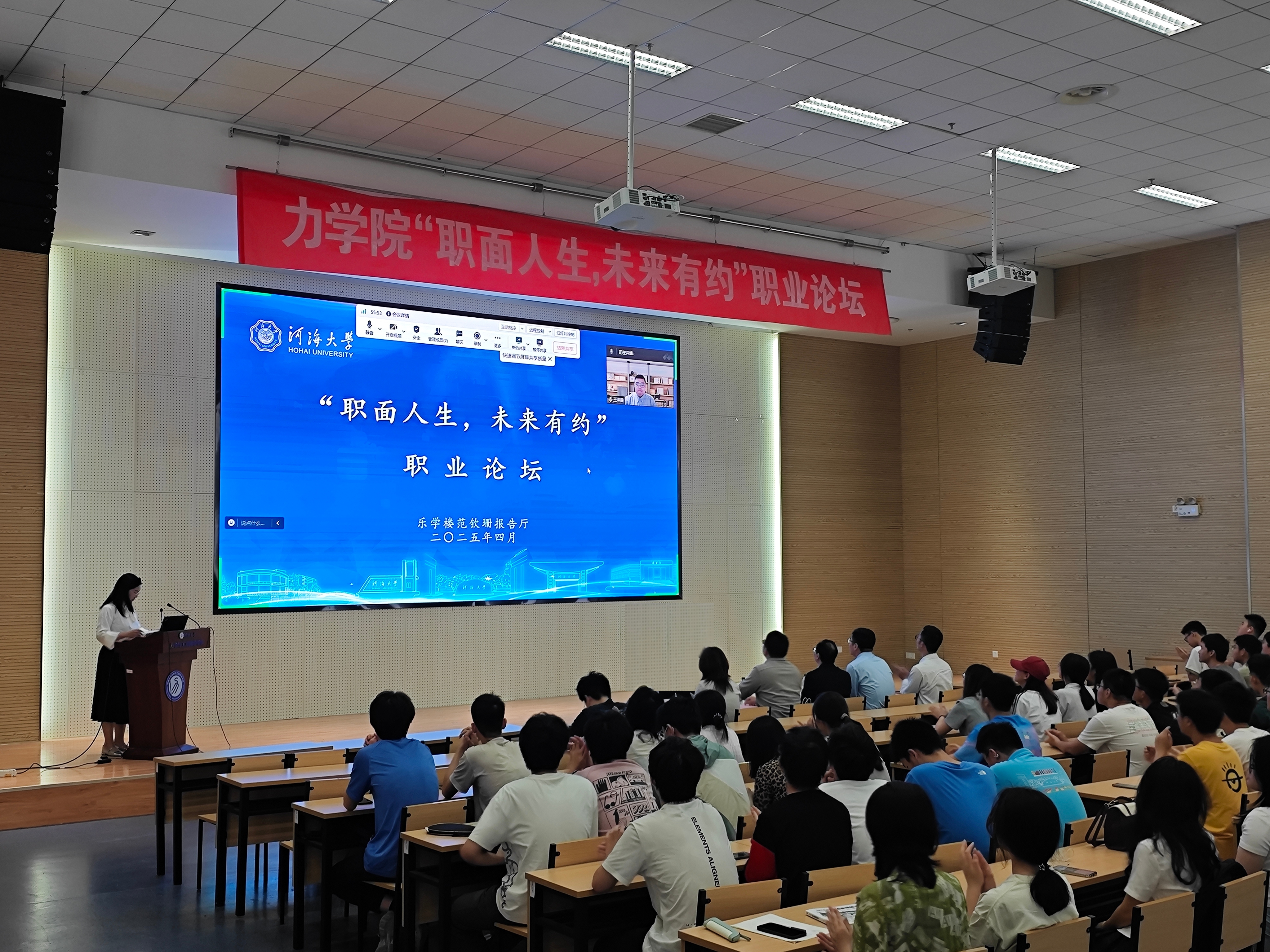 2025年4月18日,由学校学生就业指导中心和伟德体育共同主办的“职面人生,未来有约”职业论坛在江宁校区乐学楼范钦珊报告厅举行。本次活动邀请河海大学2016届应用物理学专业毕业生、飞马旅集团董事长特别助理陈金星校友,建华控股苏南区域人力资源部总负责人刑卫波总经理,河海大学2022届工程力学专业毕业生、中广核苍南核电有限公司主机工程师王泽霖校友作为主讲嘉宾。学院党委副书记、副院长刘峰,学院团委书记陈爽,本科生辅导员周蓓、李锦和200余名学生参与本次活动。