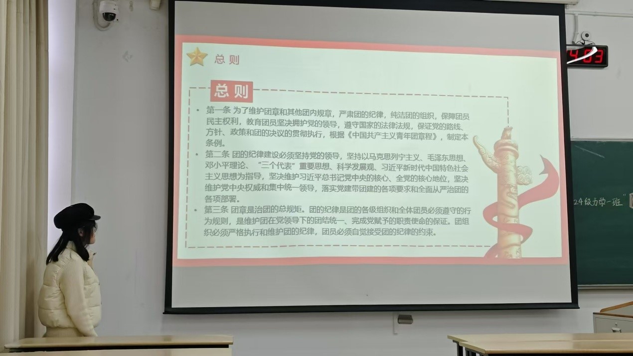 力学院团委为引导广大团员青年认真学习团章团规团纪,争做严格遵规守纪的模范,近期组织2024级本科生各团支部集中开展了学习《中国共产主义青年团纪律处分条例(试行)》(以下简称《处分条例》)主题团课活动。