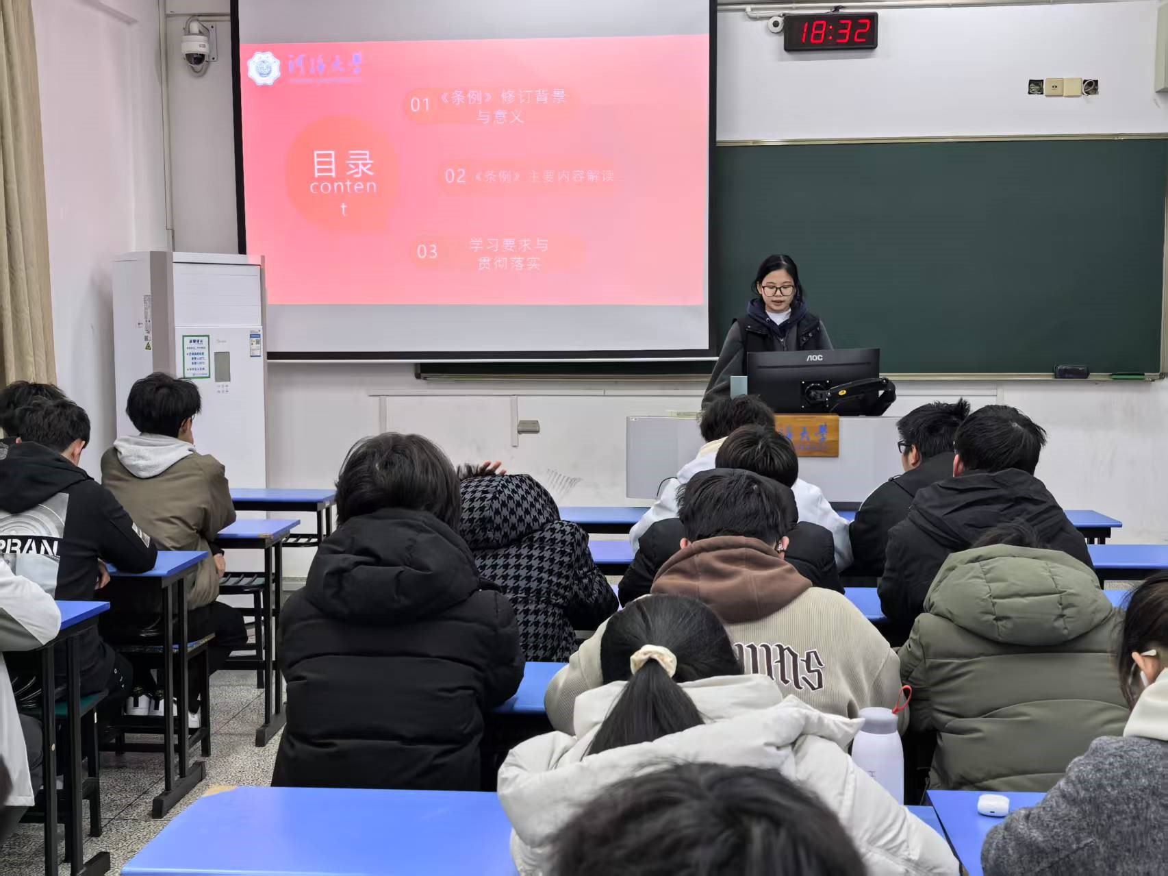 2024级力学1班团支部书记赵雨涵同学领学《处分条例》,主讲《学团纪条例,做守规团员》主题团课,进一步强化团支部团员纪律意识。班导师从团员发展角度,耐心解答同学们在学习和生活中遇到的困惑,并从专业学习、个人发展等方面提出了宝贵建议,鼓励大家勇于挑战自我,合理规划大学生活。