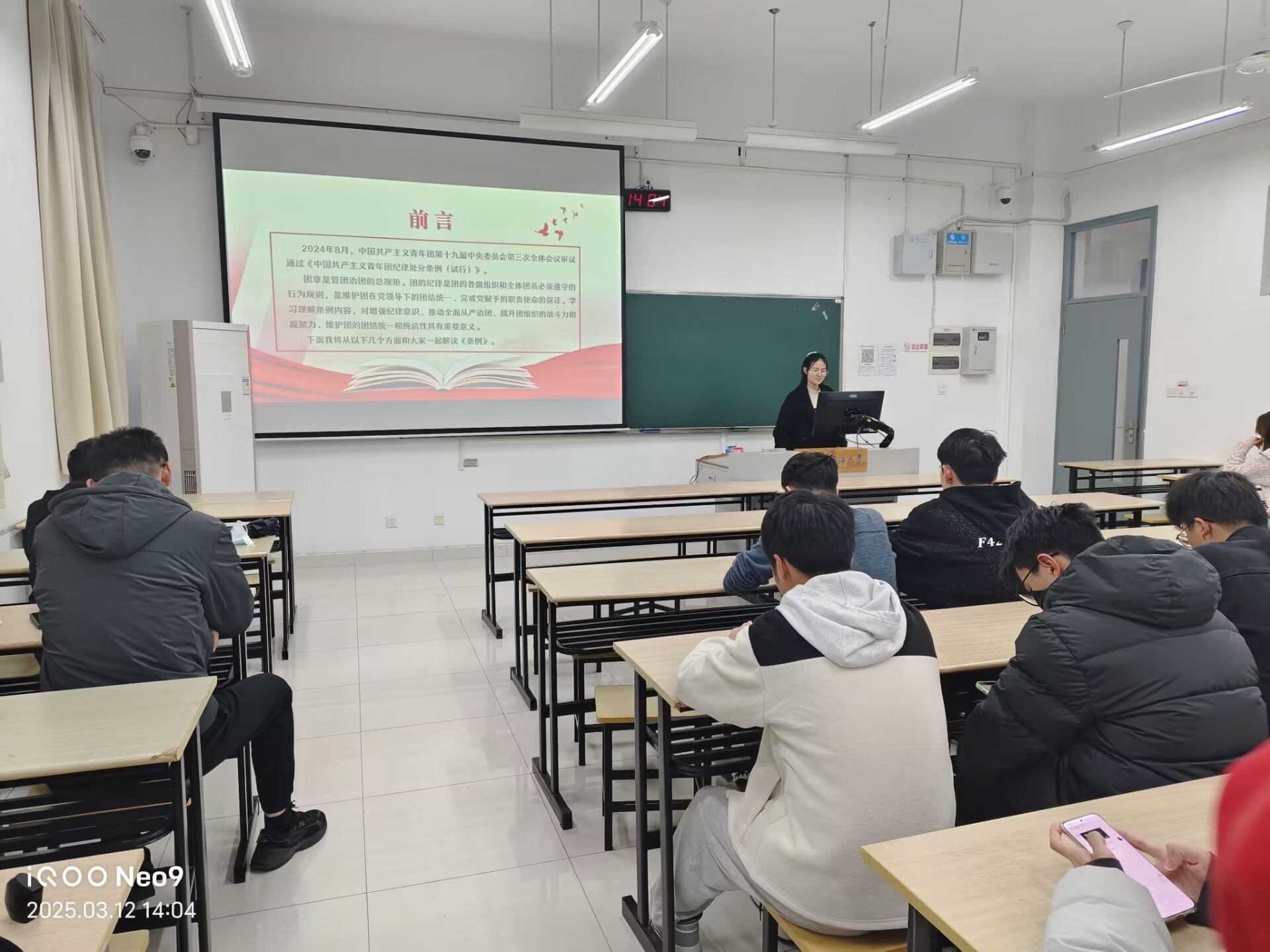 2024级物理2班团支部书记谢娜同学带领班级团员学习了《处分条例》,对于规范团员行为、维护团组织纯洁性和先进性的重大价值,从总则中纪律建设的指导思想与原则,到分则里对各类违纪行为的界定及相应处分措施,进行了详细讲解。同学们通过团支书的讲解,意识到团纪律处分条例在坚定理想信念、严守政治纪律与政治规矩方面的关键作用,提升了责任感和使命感,为班级在新学期的良好发展奠定了坚实基础。