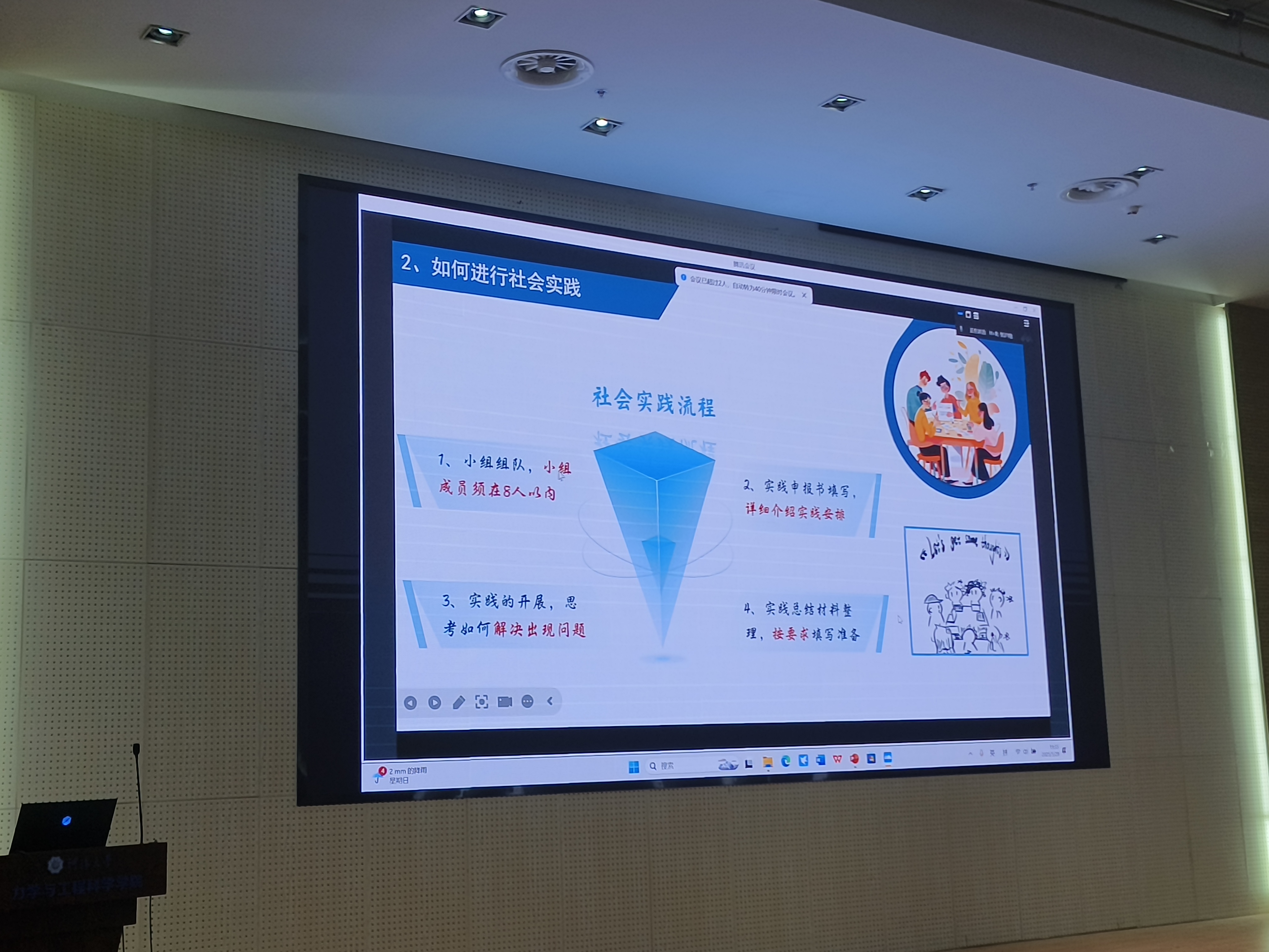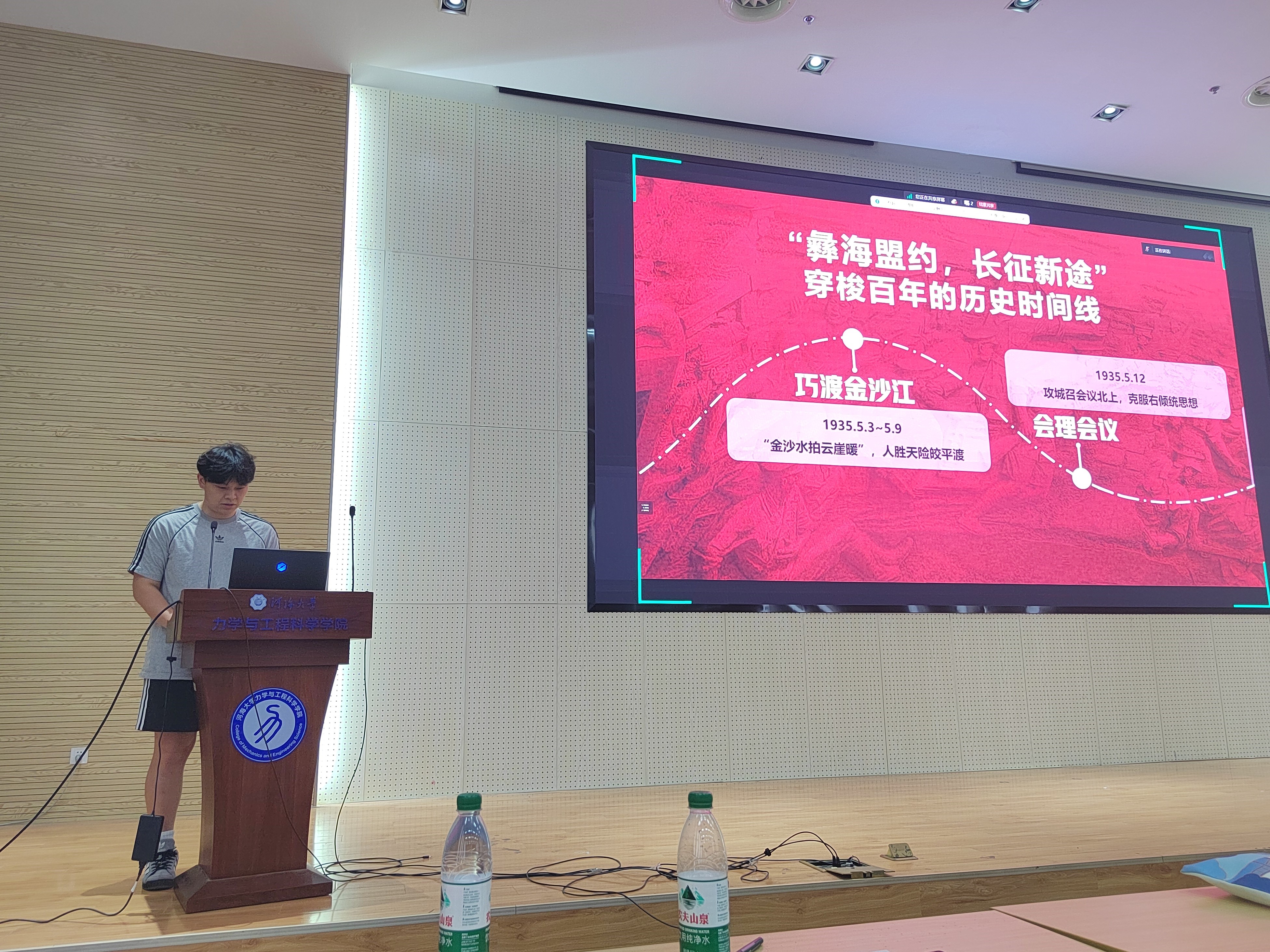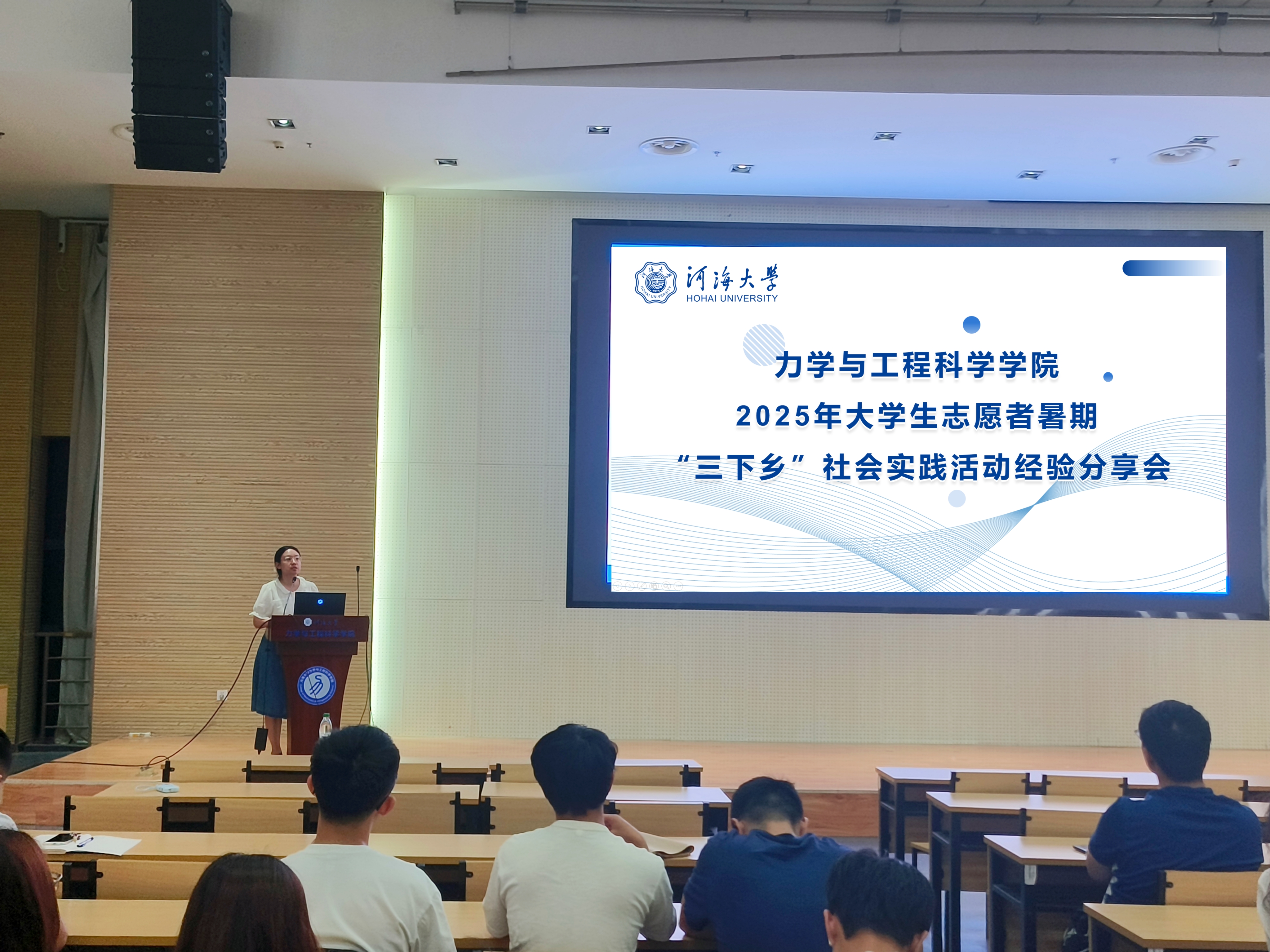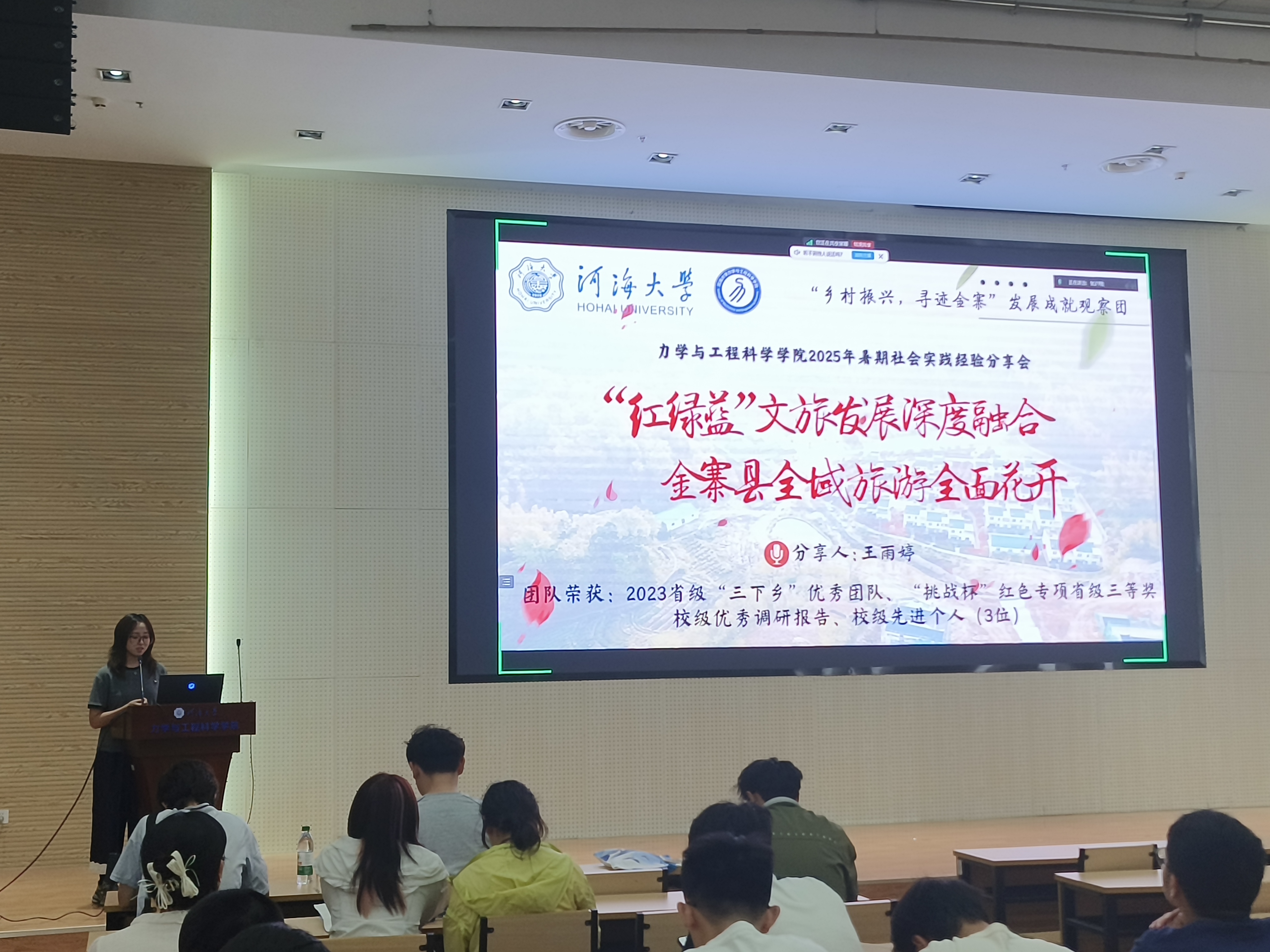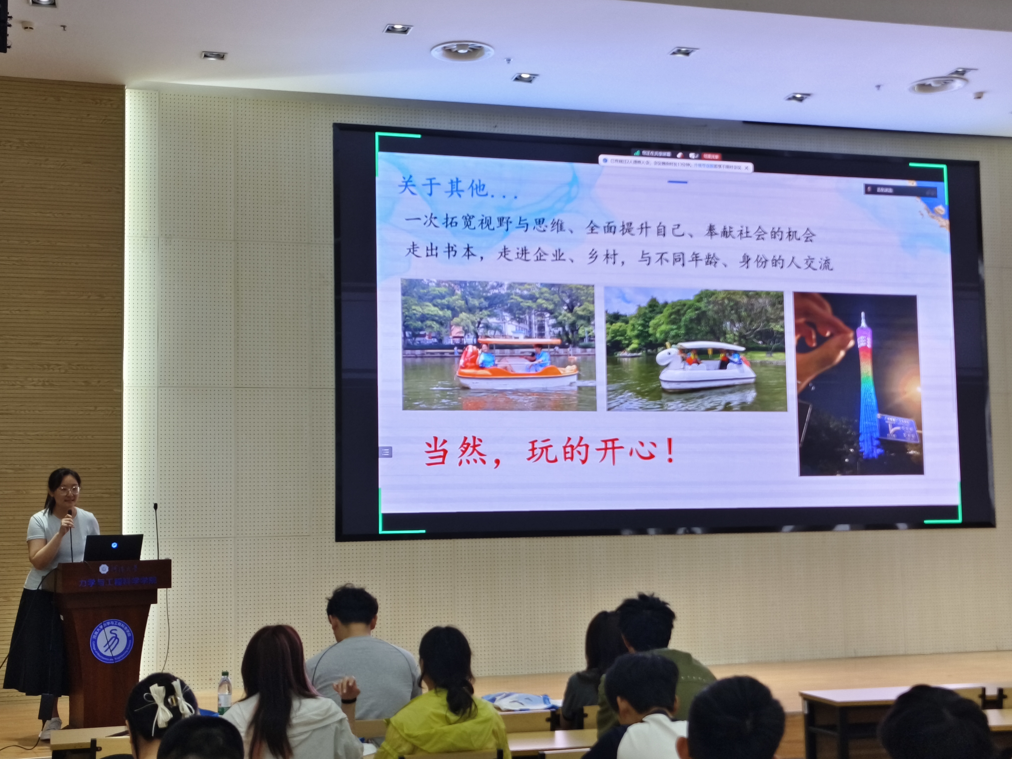 分享会邀请省级优秀团队《珠三角州岸线保护实践团》的负责人港航院2023级本科生赵安欣同学、省级优秀团队《“彝海盟约,长征新途”红色文明调研团》的负责人农工院2022级本科生何昊骏同学、省级优秀团队《“乡村振兴,寻迹金寨”发展成就观察团》的负责人公管院2021级本科生王雨婷同学、校级优秀团队《“天堑变通途”中铁大桥局就业实践团》的成员力学院2023级本科生黄嘉滨同学进行经验分享,学院团委书记陈爽和两百多名学生参加。