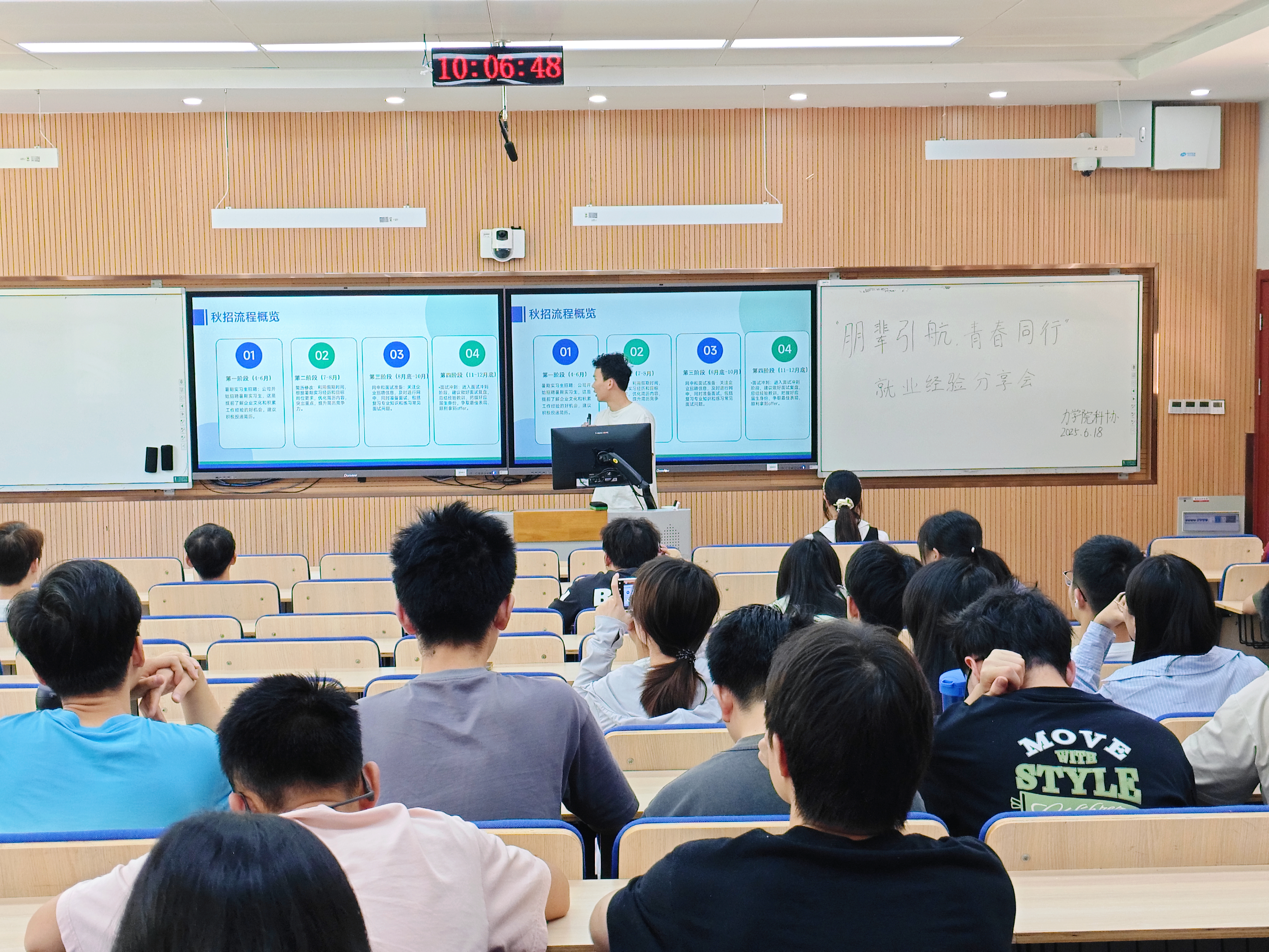 徐焱明同学结合自身求职经验,从自身定位、求职信息搜集,面试经验等方面进行了分享,并着重对秋招流程和简历制作优化两项内容给出了建议,提醒同学们要尽早开始秋招的各项准备,利用好“金九银十”,广泛投递简历。