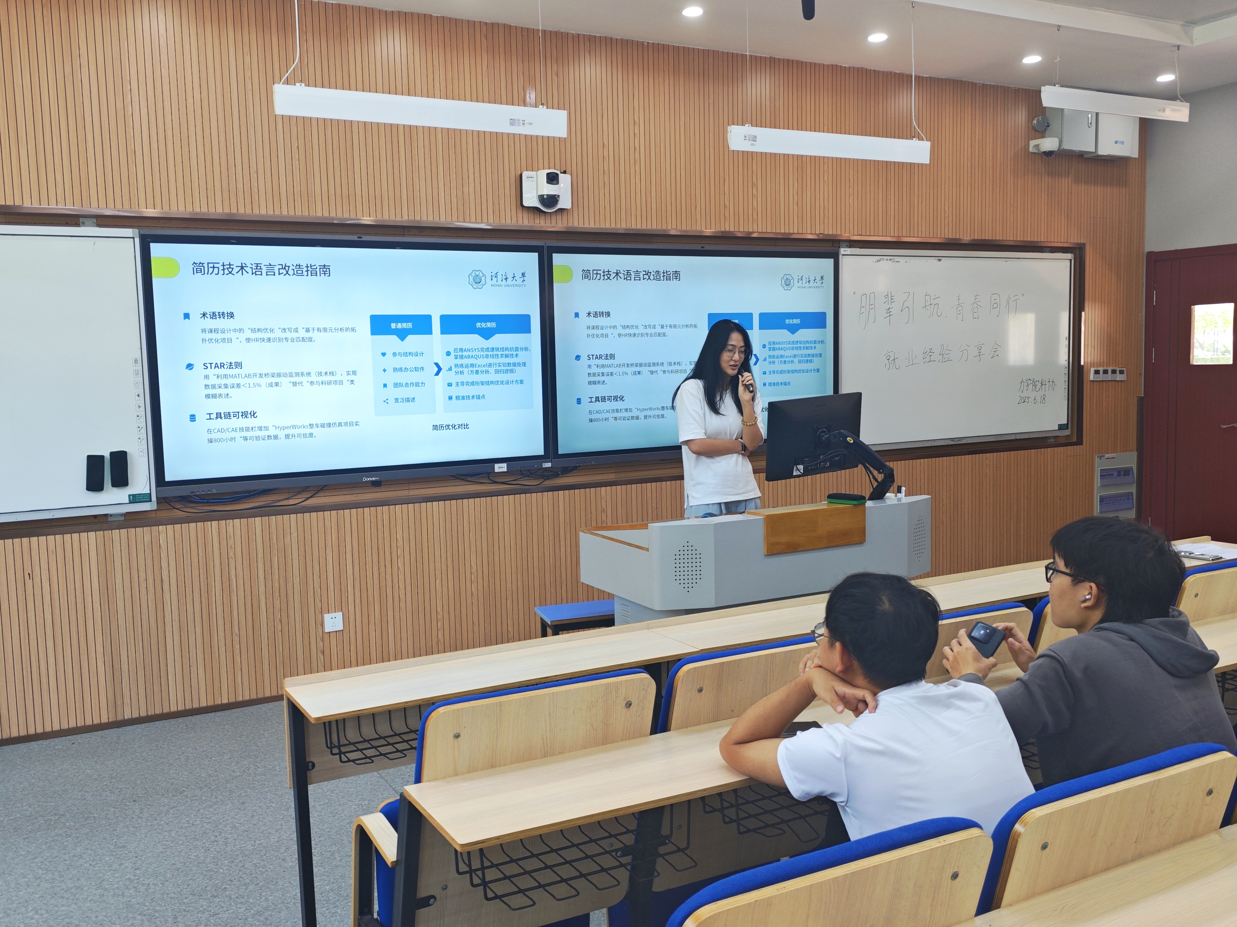 范思圆同学结合自身新能源行业的求职经历,向大家介绍了力学专业不同的就业方向,分享了从校园到职场的转换心得,并向学生工作经历比较丰富的同学提出了求职建议。