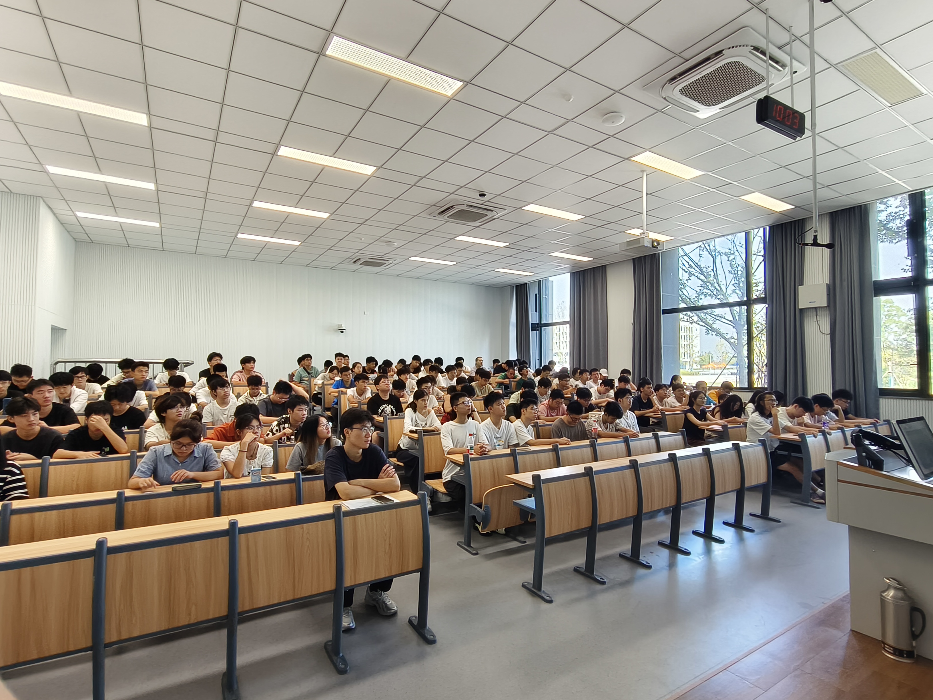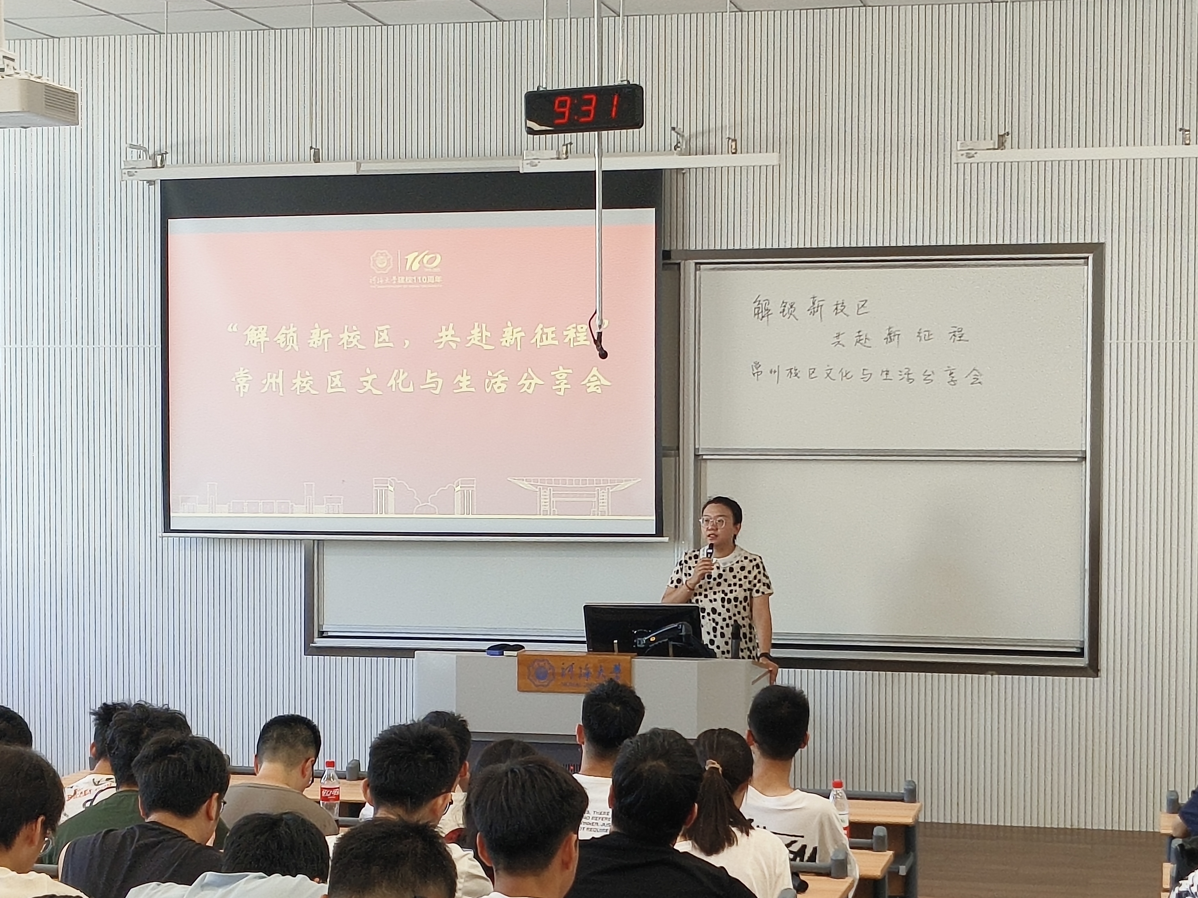 陈爽老师从常州金坛知多少、河海常韵展风华、学习生活悦成长以及校园摄影留美景四个方面展开讲述。在“常州金坛知多少”部分,陈老师从市容市貌、经济发展、文化风貌等维度,向同学们展现“中华龙城”常州和“微笑金坛”的文旅资源、现代制造业实力与城市魅力,帮助同学们对常州市及金坛区建立全面认知。在“河海常韵展风华”部分,陈老师聚焦河海大学常州新校区,详细讲解校区建设历程、设计理念与校园文化,解读校门、道路、桥梁等基础设施背后的育人期许与文化滋养,让同学们对校区有了更深刻的独特认知。在“学习生活悦成长”部分,陈老师围绕校区教室分布、交通出行、生活娱乐、校园就医等实用信息展开介绍,助力同学们清晰掌握基础设施情况,为快速适应新校区生活奠定基础。活动最后,陈老师动员广大同学参加常州校区校园摄影活动,鼓励同学们发掘校园美景、享受校园生活,为新学期留存美好记忆。
