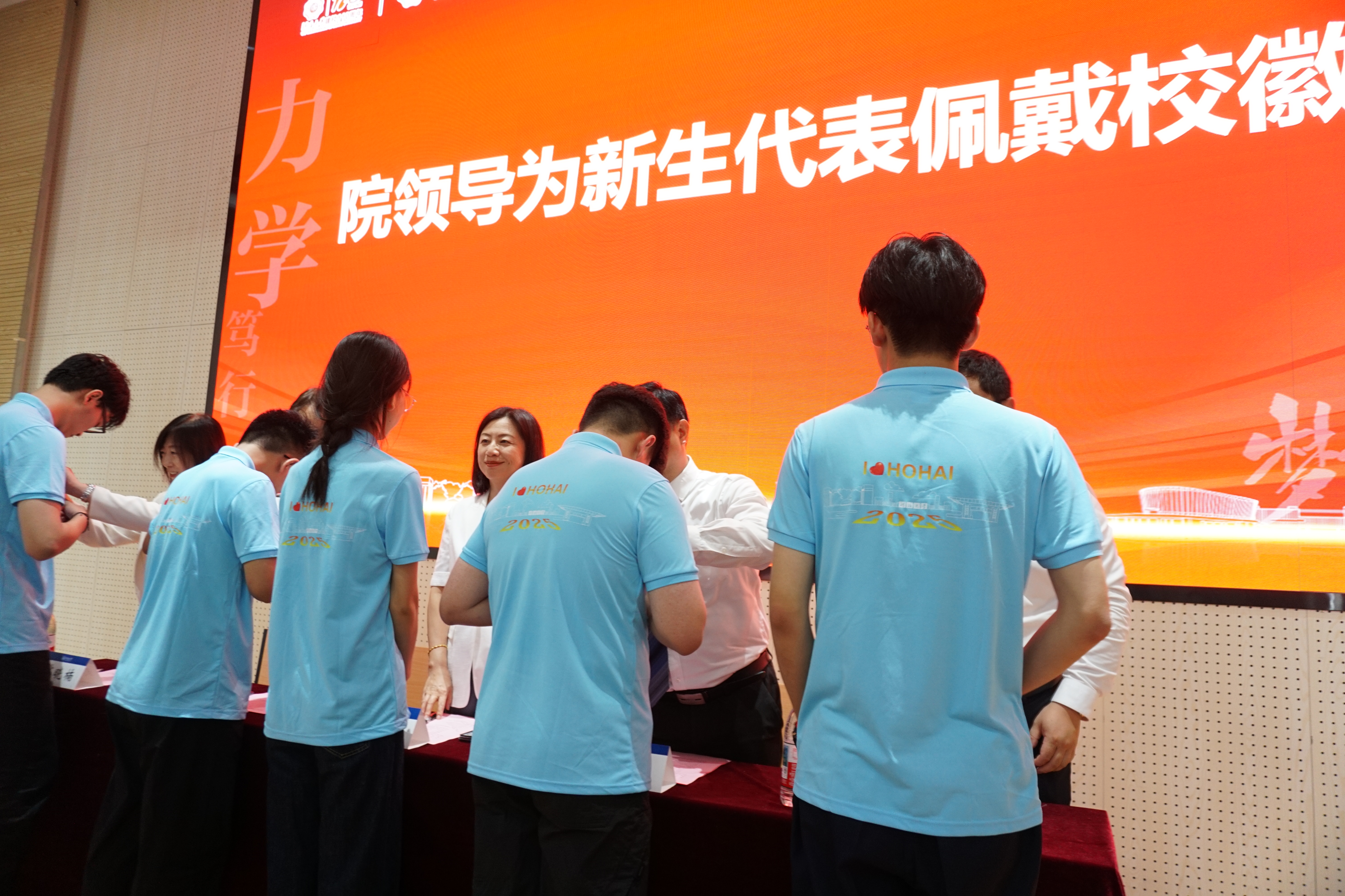 典礼上,学院领导为新生代表佩戴校徽,现场全体新生共同将校徽佩戴在胸前。别在胸前的校徽熠熠闪光,是“河海人”的象征,也承载着校训精神,激励着每一位新河海人砥砺前行,创造新的辉煌。